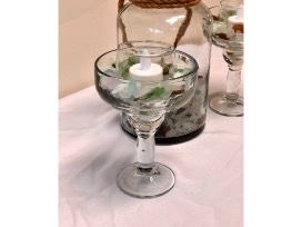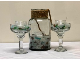 These candle holders contain beach glass collected on the shores of Lake Michigan in South Haven. The candle holders are handcrafted by Ellen, who spent hours searching for the most beautiful beach glass.