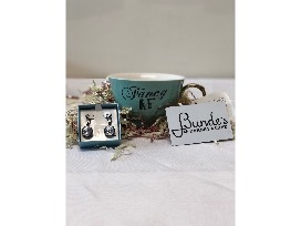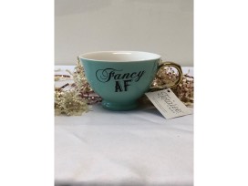 - Blue oversized teacup that reads "Fancy AF"