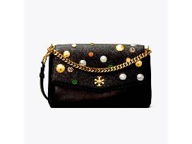 Tory Burch "Kira" New Mixed-material Embellished Black Leather Shoulder Bag