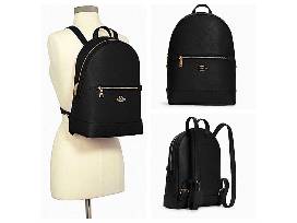 COACH "Kenley" crossgrain leather backpack features both inside and outside zippered compartments, multifunction pockets, and fabric lining. Top handle with 3 1/4" drop and adjustable shoulder straps. Measures 10" (L) x 14" (H) x 5 1/2" (W); Black/gold.