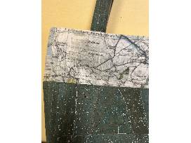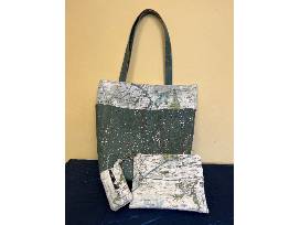 Handmade in Mystic! Lovely one-of-a-kind cork and canvas shoulder/tote bag with matching makeup pouch and tissue holder. Tote is crafted with cork imported from Portugal on the bottom and canvas on the top. This tote is completely waterproof lined and also features cork handles. Makeup pouch and tissue holder are made of canvas.