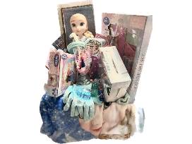 Items included: Plush throw, art set, Elsa doll, drinkware, books, puzzles, a tote bag... and much more!