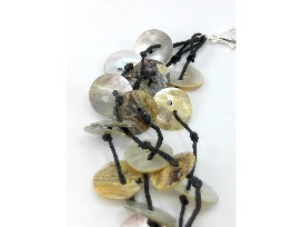 This 18 inch necklace is crafted using 5/8" mother of pearl round buttons. The buttons are ever so slightly curved, causing their color to shift when the light catches them. The classic beauty of mother of pearl makes this a very versatile piece, perfect to complement any outfit, day wear or evening wear.