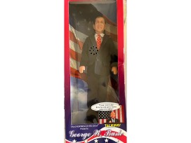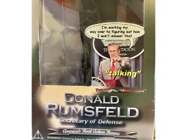 A fine collection of decades of political memorabilia...from McGovern/Eagleton funny money to F$@& Trump flip flops, topped off with Talking GWB and Donald Rumsfeld dolls. Priceless vintage collectibles in a Democratic blue striped SCOUT shopping bag. (Dolls have been heard talking recently, but no promises are made for the future.)
