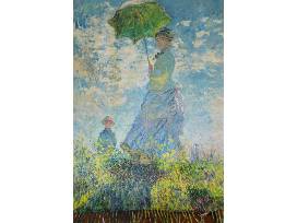 Sterling moonstone necklace with a flannel reversible scarf with flowers on one side and a woman holding an umbrella under a beautiful blue sky.