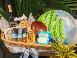 Host your next gathering with a Na'Pali ceramic platter, Salty Wahine cane sugar and grinder spice set, Hawiian Gold mustard, milo wood bowl perfect for your Kauai grown macadamia nuts, coasters and Shafer wine.