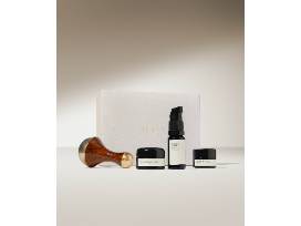Surya Spa Set is a 4 piece set that includes a Kansa wand, calming lip therapy, balancing face oil, balancing collagen cream.