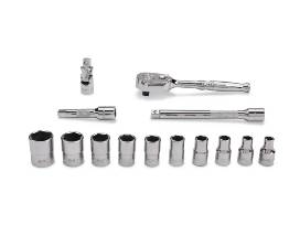 Snap-On 14 pc 1/4" Drive 6-Point SAE Shallow General Service Socket Set, Includes (10) shallow sockets (3/16-3/8, 7/16, 1/2 and 9/16") includes (1) T72 high-strength standard ratchet, (1) universal joint, (1) 2" knurled extension and (1) 4" knurled extension- Includes storage tray.