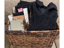 You'll stay warm and cozy in your knit long sleeve pullover and pant set (size L/XL) with slouch socks from Skims. Also includes sleep mask, travel size eye cream and KKW fragrance.