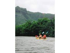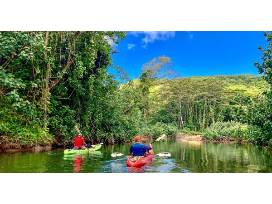 Paddle the majestic Wailua River, original home of the first Hawaiians, who paddled 1500 miles from the Marquesas Islands to Kaua`i almost 1500 years ago. After paddling past numerous Heiaus along the cliff lines of the Wailua, you will reach Kamokila village, a replica of an ancient Hawaiian village and traditionally a sacred fishing and farming area. Soon you will come to the North Fork where you will paddle leisurely through the Garden Isle's most beautiful jungle river until you come to the trailhead for Secret Falls. Enjoy a moderate hike through Kauai rainforest to an enchanting waterfall, which descends 120. into a natural pool surrounded by rocks and vegetation. Inclement weather rarely stops this fantastic journey!