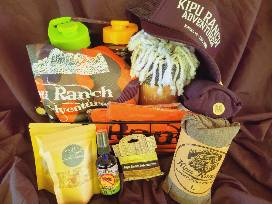 Also included is a Kipu Ranch logo gift pack including hat, lanyard 2 water bottles, dry bag, towel, 2 handkerchiefs, 2 shirts (Size M and Size L), 3 elastic wrist bands, mosquito repellent and 2 - 2 oz. Wailua granola.