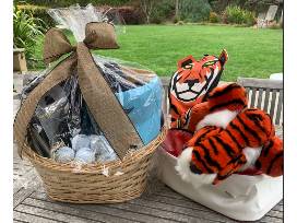 Scoop up this Golf Themed Gift Basket procured and created by the Kindergarten Families. This basket features: a 1 hour Golf Lesson at Bay Club StoneTree, $50 gift card to Worldwide Golf Shops, a Jones Sports golf shoe bag, Olympic Club men's large windbreaker jacket, Olympic Club woman's SPF hat, plush tiger golf club cover, matching tiger putter & driver head cover, box of 12 St. Hilary personalized Titleist Pro V1 golf balls, box of 12 Titleist Trufeel golf balls, 2 tokens for medium buckets of balls at McGinnis driving range, magnetic golf towel, a pocket ball washer & ball/club cleaning wipes.