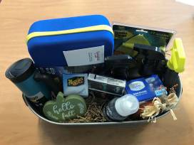This is a great car basket. First there are service vouchers totaling $315 for a 4 Wheel Alignment, full service detail, and DEXOS oil/lube and filter change w/tire rotation. In addition to the certificates there is an assortment of handy accessories that are helpful to have in your car and for your car.