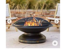 Entertain guests or spend a quiet evening relaxing by a fire in this steel construction pit with an authentic wood burning design. Decorative slate trim adds an elegant touch and a steel mesh safety screen. The donor has graciously filled the interior with everything needed to make deluxe smores while the fire is going.