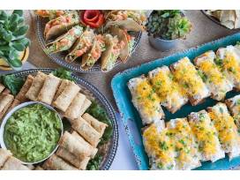 Assortment of golden and crunchy miniatures including mini green chimis, mini red chimis, mini bean chimis, chicken and beef taquitos. Chips, hot sauce and guacamole included!