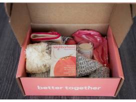 Boxes include: an eye mask, healthy snacks, a mug, comfy socks, and much more!