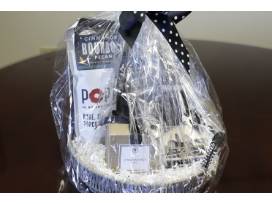 - A gift basket from Joseph Beth with Cincinnati skyline-themed coasters, a book called "Hidden History of Cincinnati", a Cincinnati candle, tumbler and snacks.