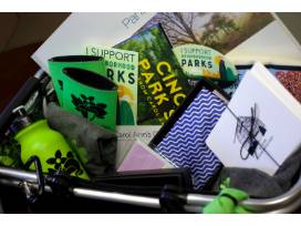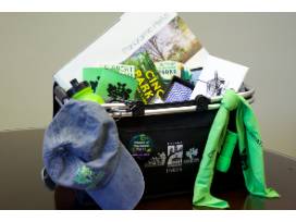 Cincinnati Parks picnic basket with swag! Perfect for your favorite Cincy parks lover! Includes: Cincinnati Parks Foundation picnic basket, Panoramic Parks coffee table book by Cincinnati photographer Thomas R. Schiff, Bow tie and scarf made for the Cincinnati Parks Foundation from former Bengal Dhani Jones' Bowtie Cause, Carol Ann's Carousel (Smale Riverfront Park) Paintings booklet & notecards, Cincinnati Park Scenes from Carol Ann's Carousel children's book, Cincinnati Parks Art Deco Card Set, Cincinnati Parks Foundation "I Support Cincinnati Parks" Tote Bags (Spring) and Bumper Stickers (rectangle and oval), Cincinnati Parks Foundation beverage koozies, T-shirt, gray canvas baseball hat, gray knit hat, green bandana, green flashlight key ring, green carabineer key ring, green water bottle and Friends of Cincinnati Parks button.