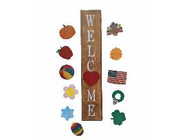 Indoor welcome sign with interchangeable seasonal cutouts for the "O"