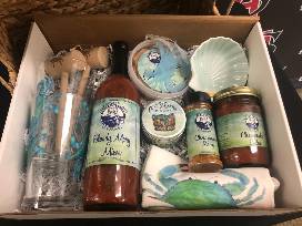 $150 gift certificate to any of Local by Design's 3 locations and a Merry Mermaid Gourmet basket complete with bloody mary mix, cocktail rimmer, salsa with serving spoon, chesapeake spice, handwash, decorative towel, crab ornament, 2 painted crab glasses and a pair of crab mallets.