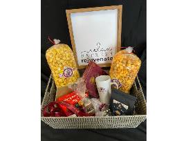 2 $10 gift cards to Osage River Popcorn, Refresh white board sign, gourmet chocolates, coffee, coffee cup, 2 family size bags of popcorn