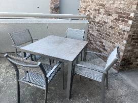 All Aluminum frame with texilene mesh seat and back. Chairs are stackable. High Pressure Laminate table top.