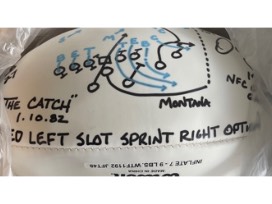 Autographed white 49ers Logo'ed Football autographed by Dwight "The Catch" Clark. Autograph includes the full play inscribed from the memorable touchdown during the 1982 NFC Playoffs.