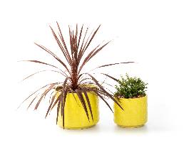 Cordyline australis 'Red Star' & Portulacaria afra in glazed, yellow pots.
