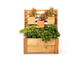 Crassula ovata 'Mini', Crassula ovata 'Sunset', Crassula 'Campfire' in a wooden, table top planter.