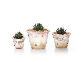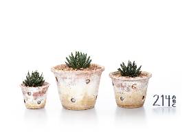 Trio of Agave victoriae-reginae in white terracotta swiss cheese pots. (5 inches Tall; 6.5 Inch in Diameter, 5 inches Tall; 6 Inch in Diameter, 6.5 inches Tall; 9 Inch in Diameter)