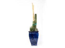 Stenocereus marginatus, Ferocactus, Euphorbia antisyphilitica in tall, blue, glazed pot.