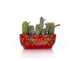 Echinocereus, Echinocereus, Mammillaria in long, red talavera pot.