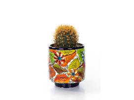 1Ferocactus chrysacanthus in a multi-colored, floral, talavera pot.