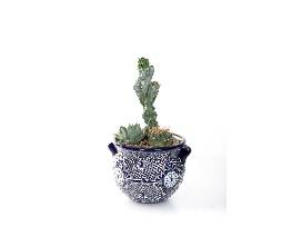 Ferocactus pilosus, Agave parryi var. truncata, Astrophytum in blue & white talavera pot.