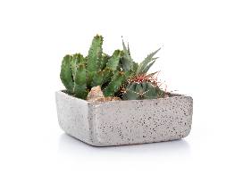 Medium grey speckled square pot with Ferocactus pilosus, Euphorbia resinifera, Agave parryi var. parryi.