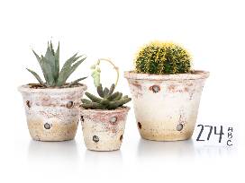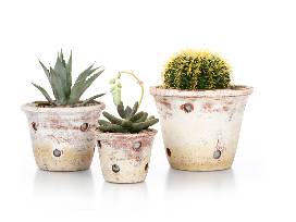 White washed terracotta, swiss cheese pots trio with a Golden Barrel (Echinocactus grusonii), Agave parryi var. parryi and Echeveria 'Dark purple'.