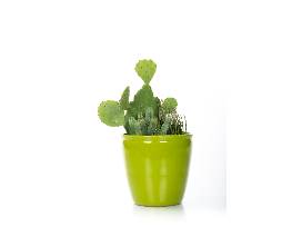 Large lime green glaze pot with Euphorbia resinifera, Euphorbia antisyphilitica, Opuntia gomei 'Old Mexico'.