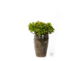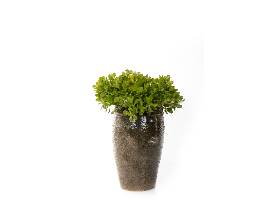 Tall, brown glazed textured pot with a Crassula ovata 'Bush'.