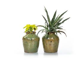 Duo of glazed turquoise, jug pots with an Agave murpheyi and Tropical Foliage Upright.
