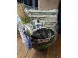 This blue-themed basket is chock full of beautiful things to help keep you comfortable out on your porch or patio.