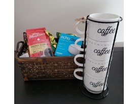 Cuisinart Coffee Maker, bag of coffee, (4) coffee mugs and an Amazon Echo Dot