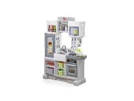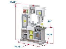 A cozy play kitchen packed with tons of kid-friendly functionality! Includes a farmhouse-style apron sink, oversized refrigerator, oven with window, 24-piece accessory set of dishes and cookware, and more great features. Get cooking with the real lights and sounds on the stovetop (2 AA batteries needed)! When playtime fun is done, the storage bins, shelving, and hanging hooks give every accessory a place for mini chefs to easily store away for next time!