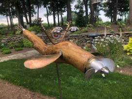 Take home this priceless garden sculpture, made of driftwood, repurposed items including various sized propellors, musical instrument mouthpieces, mechanical gages, copper tubing, brass hands, and other items. This unique piece is created by local artist, Geoff McCreary.