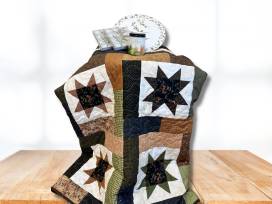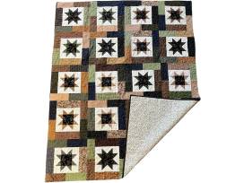 Bring this beautiful 59" x 73" quilt home. Made lovingly by Tuesday Night Quilters at Kelly's Sewing Corner. Also included is a cake plate , matching napkins and a "Walk in the Woods" scented candle.