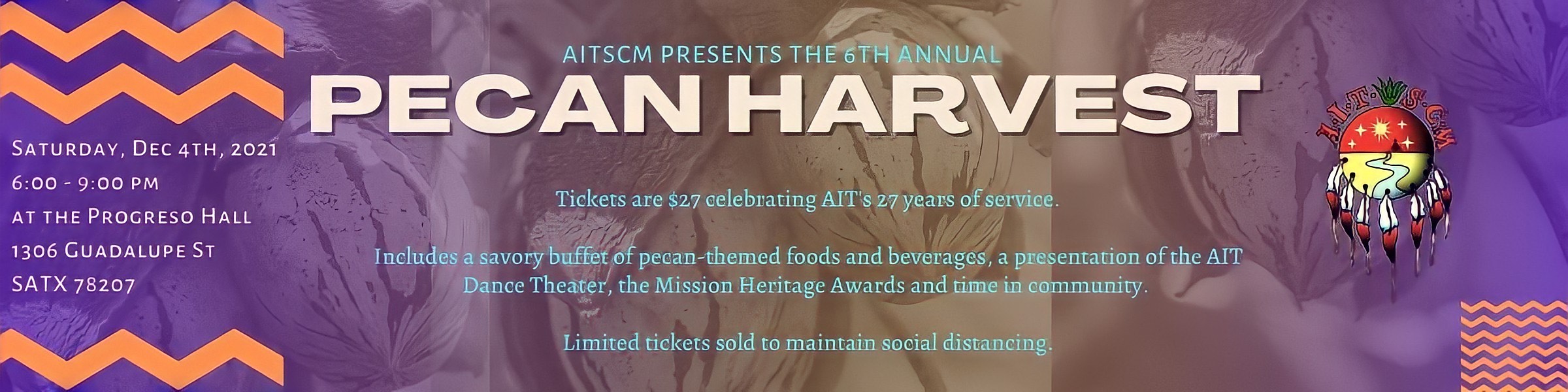 American Indians in Texas at the Spanish Colonial Missions (AIT-SCM) will hold its sixth annual Pecan Harvest gala to celebrate the aboriginal people of this land and their ancestral practice of harvesting pecans in the late fall. We are thrilled to provide a savory buffet of pecan-themed foods and beverages, a presentation of the AIT Dance Theater, the Mission Heritage Awards, and time in community.