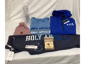 Your Angel will love her royal blue Pack-n-Go Pullover, V-neck Holy Angels T (Both in Medium), a pair of heather grey and blue Fleece Joggers (L), a pink textured Cuff Beanie, a custom AHA Demarest Bracelet by Wind and Fire, an AHA Spirit Scrunchie, and twist off Water Bottle.