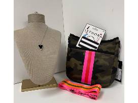 - Green camo/pink orange stripe. Solid army and pink/orange/army/orange/ pink straps; 8.5" x 2" x 9.5"