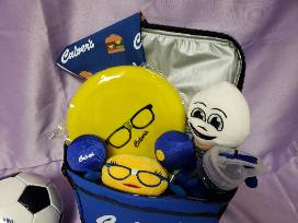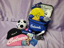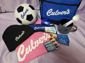Also included: cooler, water bottle, coffee cup, custard scoop, 2 Culver's plush toys, soccer ball, Frisbee, 2 small balls, black hat, blue ear cover, pink t-shirt (L), dog bandanna, and dog waste bag dispenser.