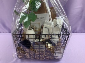 Enhance your home with items designed by Joanna Gaines. Includes wire basket, serving paddle, Magnolia Table cookbook, flour sack towels, measuring cups & spoons, a candle, and greenery in a vase.