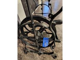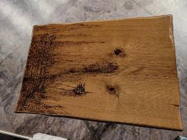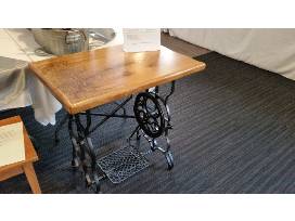 Beautiful antique sewing maching end table with a white oak top with a burnt lake scene.